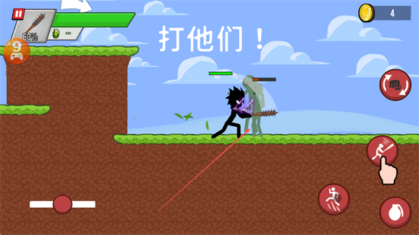 1、點擊右側(cè)攻擊按鈕,操控火柴人攻擊僵尸,消滅敵人獲取金幣。