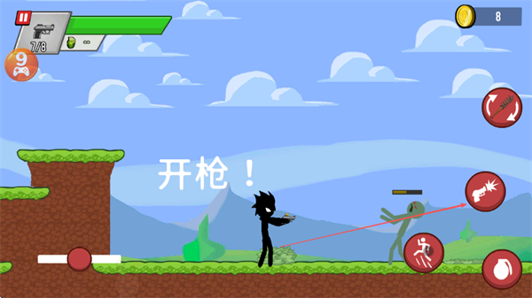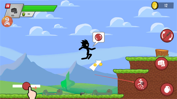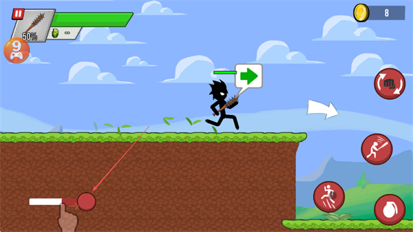2、滑動左側(cè)搖桿,控制火柴人向右移動,探索地形,尋找新的敵人和資源。