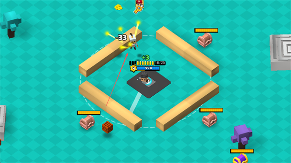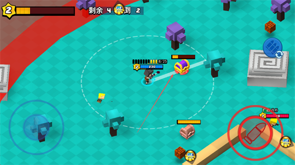 1、攻擊紫色寶箱獲取道具,提升戰(zhàn)力,同時(shí)瞄準(zhǔn)敵方玩家,發(fā)起進(jìn)攻。