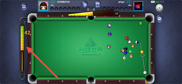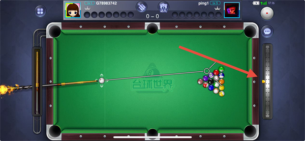 2、進(jìn)入對局后,通過滑動右側(cè)標(biāo)尺調(diào)整擊球力度,力度大小會影響擊球后的速度與目標(biāo)球的移動距離,需根據(jù)目標(biāo)球與袋口的距離合理調(diào)整。