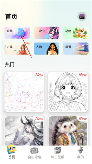 1、在愛涂壁紙首頁,點擊唯美分類選項,進(jìn)入唯美分類頁面。