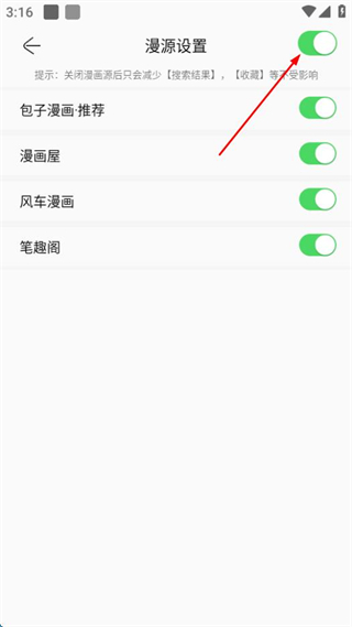 3、在漫源設(shè)置頁(yè)面,可通過(guò)開(kāi)啟來(lái)開(kāi)啟漫畫(huà)資源來(lái)源。