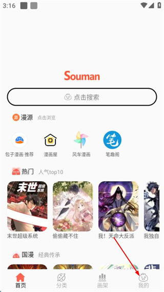 1、在漫畫(huà)屋首頁(yè),點(diǎn)擊右下角我的選項(xiàng),進(jìn)入個(gè)人頁(yè)面。