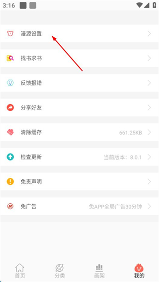 2、在個(gè)人頁(yè)面,點(diǎn)擊漫源設(shè)置選項(xiàng),進(jìn)入漫源設(shè)置頁(yè)面。