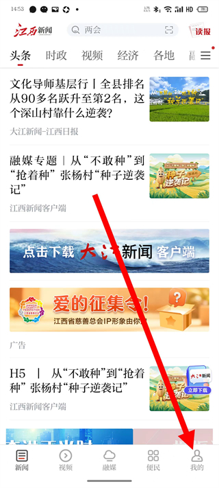 1、打開江西新聞,在首頁點(diǎn)擊底部我的,進(jìn)入我的頁面。