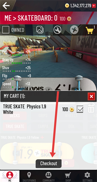 4、購物車頁面點擊“Checkout”,完成滑板購買操作。