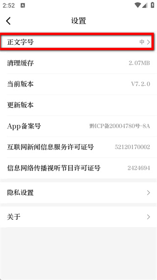3、在設(shè)置頁面,點(diǎn)擊正文字號選項(xiàng),進(jìn)入正文字號設(shè)置頁面。