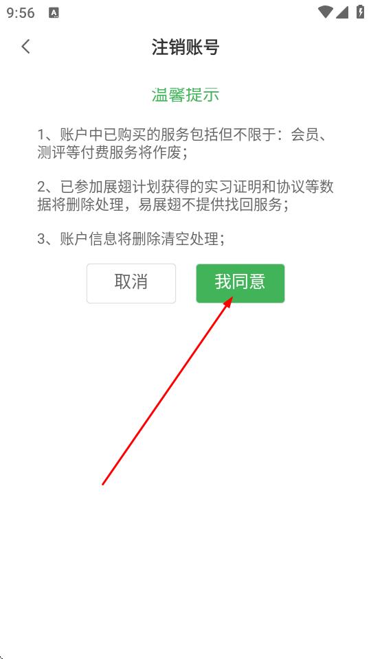 5、在注銷賬號(hào)提示頁面,點(diǎn)擊我同意,完成注銷操作。