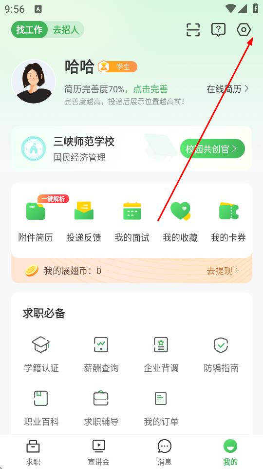 2、在我的頁面,點(diǎn)擊右上角的設(shè)置圖標(biāo)。