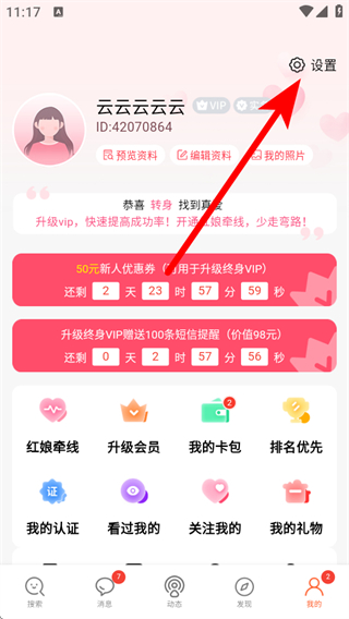 1、打開一線姻緣應(yīng)用,點擊我的頁面右上角的設(shè)置圖標。