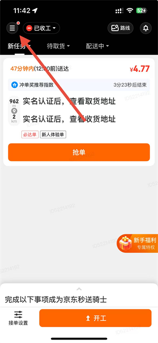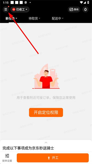 1、在京東秒送騎士app頁面點擊左上角的菜單圖標(biāo),進(jìn)入個人頁面。