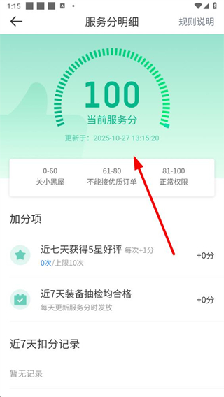 4、在服務(wù)分明細(xì)頁面可查看當(dāng)前服務(wù)分、加分項和扣分記錄等信息。