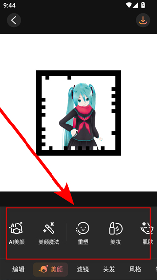 3、圖片選擇后,可在下方使用AI美顏、美顏魔法、重塑、美妝、肌膚等功能對(duì)圖片進(jìn)行美顏編輯。