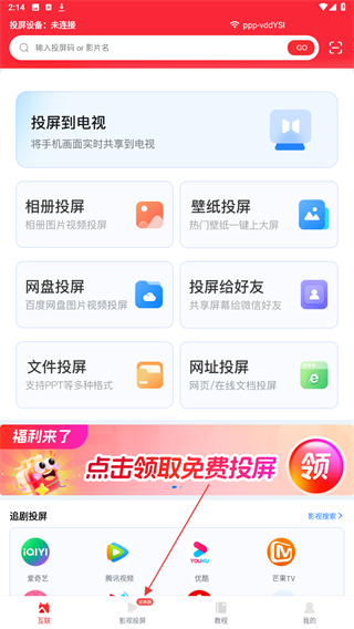 1、啟動樂播投屏的APP,進入首頁點擊下方影視投屏的按鈕。