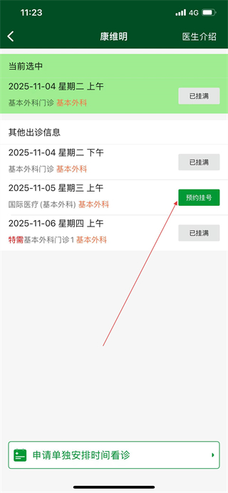 5、在醫(yī)生出診信息頁(yè)面選擇可預(yù)約的出診時(shí)間,點(diǎn)擊預(yù)約掛號(hào)。
