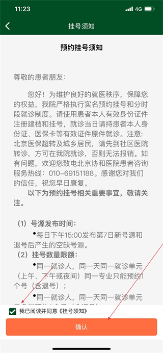 2、在掛號(hào)須知頁(yè)面,勾選我已閱讀并同意掛號(hào)須知,點(diǎn)擊確認(rèn)。