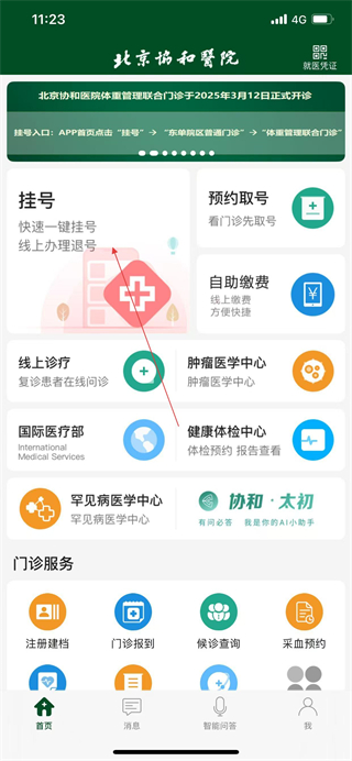 1、打開(kāi)北京協(xié)和醫(yī)院APP,在首頁(yè)點(diǎn)擊掛號(hào)選項(xiàng)。