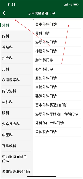 3、進(jìn)入東單院區(qū)普通門(mén)診頁(yè)面,選擇科室,再選擇具體門(mén)診。