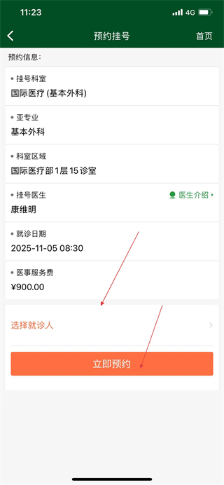6、在預(yù)約掛號(hào)頁(yè)面選擇就診人后,點(diǎn)擊立即預(yù)約,即可完成掛號(hào)操作。