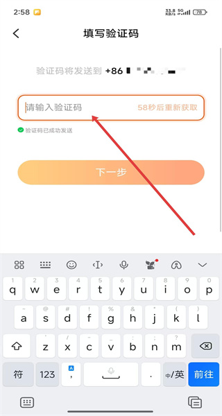 2、進(jìn)入到驗(yàn)證頁(yè)面中,在輸入框中填寫(xiě)獲取到的驗(yàn)證碼后,可以進(jìn)入下一步。