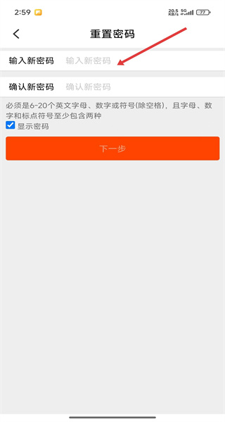 4、在進(jìn)入到重置密碼頁(yè)面中,點(diǎn)擊輸入框即可進(jìn)行密碼的重置,再點(diǎn)擊下一步即可完成找回操作。