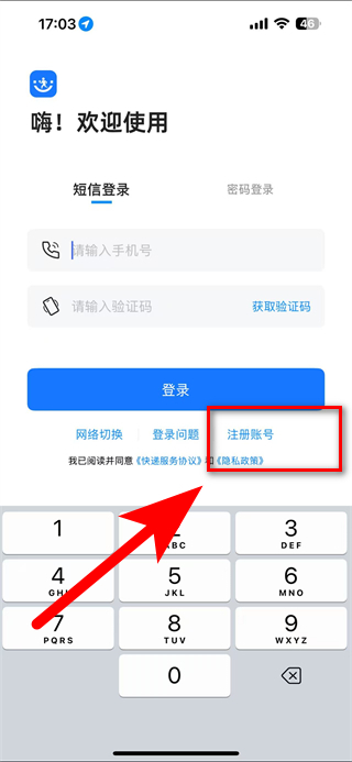 1、打開韻達(dá)業(yè)務(wù)員APP,在登錄頁面點(diǎn)擊注冊(cè)賬號(hào),進(jìn)入注冊(cè)界面。