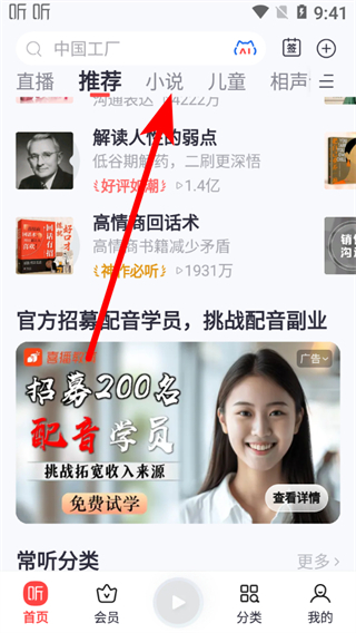 1、在喜馬拉雅首頁(yè),點(diǎn)擊小說(shuō)選項(xiàng),進(jìn)入小說(shuō)分類(lèi)頁(yè)面。