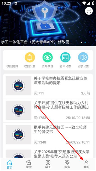 1、打開民大青年app,點(diǎn)擊底部導(dǎo)航欄中的我的選項(xiàng)。