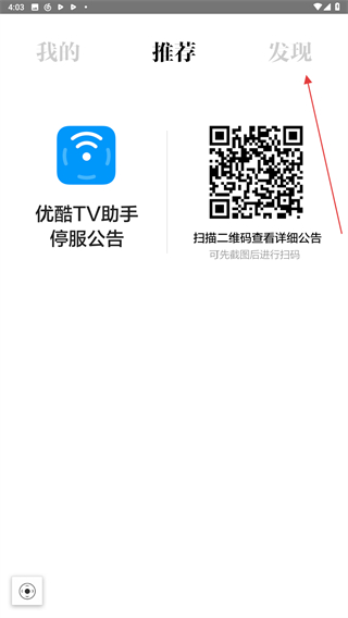1、打開阿里tv助手的應(yīng)用,點擊右上發(fā)現(xiàn)的按鈕。