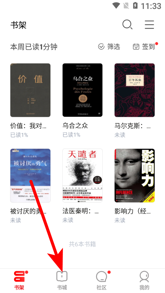 1、在京東讀書書架頁面,點擊下方書城選項,進入書城頁面。