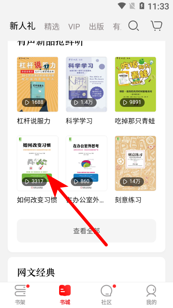 2、在書城頁面,點擊想要聽的書籍封面,進入書籍詳情頁面。