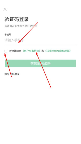 2、在驗(yàn)證碼登錄頁面輸入手機(jī)號(hào),勾選協(xié)議后,點(diǎn)擊獲取短信驗(yàn)證碼。