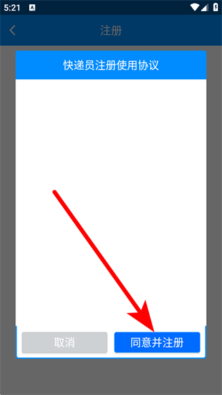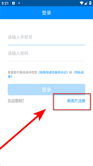 1、打開格格快遞員APP,在登錄頁面點擊新用戶注冊,彈出快遞員注冊使用協(xié)議框。