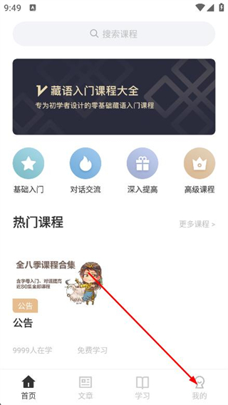 1、打開天天學(xué)藏語app,點(diǎn)擊底部導(dǎo)航欄的我的選項(xiàng)。