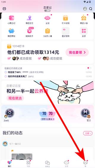 1、打開(kāi)戀愛(ài)記應(yīng)用,點(diǎn)擊底部導(dǎo)航欄的我進(jìn)入個(gè)人頁(yè)面。
