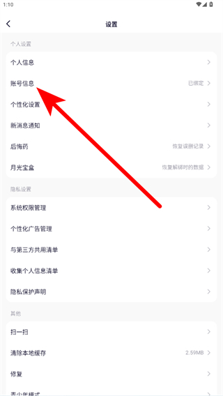 3、進(jìn)入設(shè)置頁(yè)面后,下滑找到賬號(hào)信息選項(xiàng)并點(diǎn)擊。