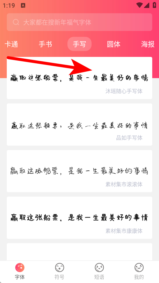2、在手寫字體分類下,瀏覽并選擇自己喜歡的字體,比如沐瑤隨心手寫體。