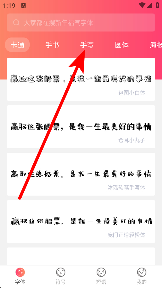 1、打開手機上的字體應用,在字體分類欄中點擊手寫選項。