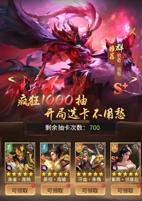 3、瘋狂1000抽活動(dòng)每日登錄可獲大量抽卡次數(shù)支持模擬十連抽后自主選擇心儀武將便于玩家精準(zhǔn)組建陣容提升收集效率。